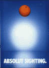 ABSOLUT SIGHTING is a new ad on page 21 of the 7/12/99 issue of ESPN mag. This 1999 ad, photographed by Steve Bronstein, has some of the elements of the traditional ad: there\'s a bright white spotlight shining on a dark background and reflecting on to a shiny flat surface. However, the background is blue, not black, and there\'s something important missing: where\'s the Absolut bottle? Sighted, where the top of the bottle should be, is a mandarin orange floating in the air, as the vanguard of a Absolut Mandrin bottle soon to arrive.