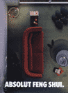 ABSOLUT FENG SHUI is a new ad featuring an overhead view of a living room, where a sofa, an end table and a reflective-topped table line up to form the world famous "Absolut shape". TBWA, photo by Joe Magrean (his first Absolut ad?) and ?001 are printed up the left margin.