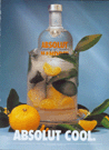 ABSOLUT COOL. This new Canadian ad shows a bottle of Absolut Mandrin vodka being kept cool, partially enclosed in a solid circular chunk of ice. Frozen inside the wall of ice are sprigs of leaves and mandarin orange slices. This is all resting on a clear glass plate, surrounded by m re leaves and mandarin oranges, and resting on a blue table, against a blue background. This is a rare ad (the first that I've ever seen) with the copyright year (2001), but without the copyright symbol ?being shown.