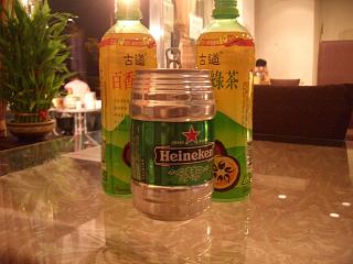左手拿330CC的海尼根啤酒右手拎600CC的古道百香綠茶