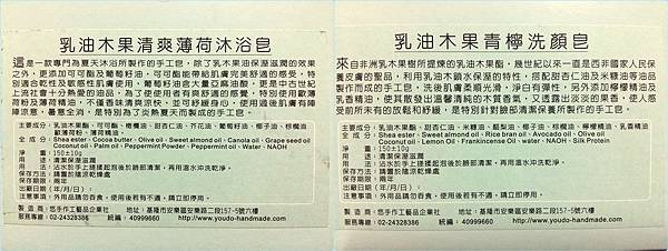 <悠作you-do手作皂>使用100%進口植物油作為原料,利用各種植物上天賦予的特性,製作出貼近肌膚的手工皂。他沒有漂亮的顏色,沒有濃郁的味道,只有香皂在皂化過程中自然形成的色澤,只有純淨精油帶出的香味。所有產品不添加防腐劑,起泡劑,色素及人工香精,並且皆通過SGS檢驗.