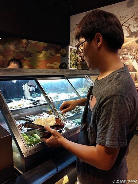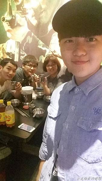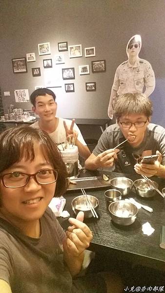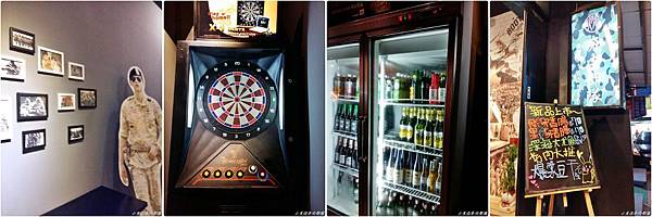 店內的設計就是太陽的後裔~宋仲基的人形立牌,牆壁上的迷彩畫和野戰圓帽;我們坐的椅子是圓桶,非常貼心地打開坐墊可以放置背包喔.還有一台電子飛鏢機,酒酣耳熱之餘還可以射飛鏢來助興.
