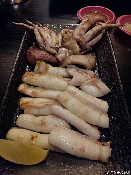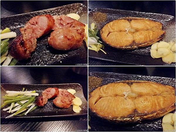 倒是要說說這大尤魚,新鮮度可以從觸角看出來,不小心勾到醬油碟,連碟子都被勾起來了,通常大尤魚燒烤之後,肉比較容易偏柴,如果稍微生分一點,又會咬不動。但夯肉部隊的大尤魚一點也不會喔!我想除了非常新鮮之外,燒烤功夫真的不是蓋的。對了,要提一下飛魚卵香腸,咬下去聽得到卵爆裂的啵啵聲,雖然很貴但也算是嘗鮮了.另外我們還點了鮭魚,魚皮脆魚肉鮮美,上色剛好不焦不淡,非常秀色可餐。老實說食材新鮮、種類繁多的夯肉部隊,加上老闆娘一流的燒烤技術;讓我們的情人節晚餐吃得酒足飯飽,尤其是這酥香(豬油)拌飯更是錦上添花.