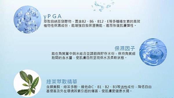 他清新水嫩的質地蘊含高效能保濕因子y-PGA 和保濕因子Sodium PGA以及綠茶精華,能溫和且迅速調理肌膚提升後續保養效率.每天早晚持續使用,就能輕鬆打造豐沛水嫩肌底展現潤澤美肌.