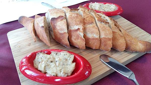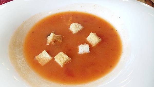 番茄濃湯加上酥脆麵包丁,和有名的法國金棍麵包配上香濃的風味塗醬;雖然只是套餐必備的湯與麵包,但一點也不馬虎,光看法國麵包上的氣孔,和番茄濃湯裡的有機番茄,就知道細節決定了一切啊!
