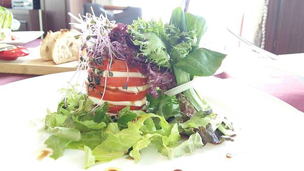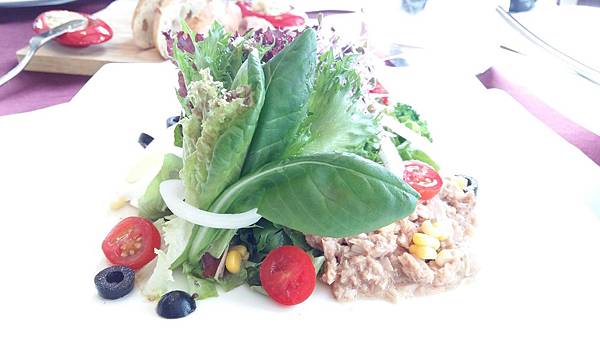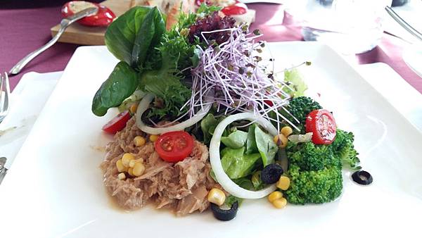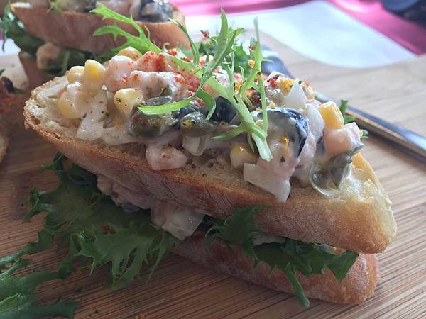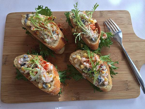 法國金棍麵包奶油燻鮭魚,鮭魚丁加上許多的蔬果和水耕蔬菜,仍舊吃得出鮭魚的獨特滋味,蔬果丁們玉米洋蔥酸豆橄欖扮演了相得益彰的功能.尤其水耕蔬菜的點綴其上有神來一筆的效果.