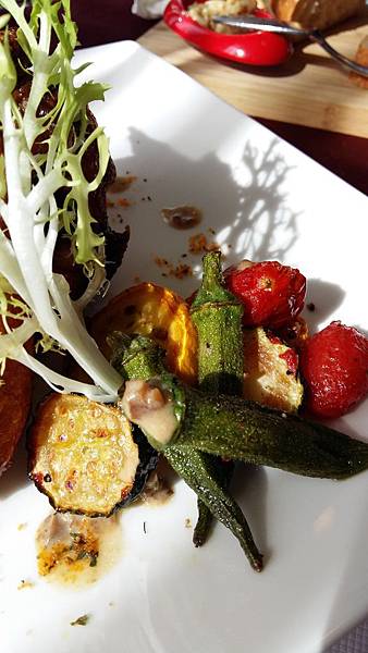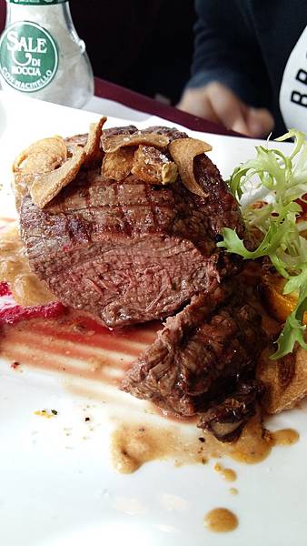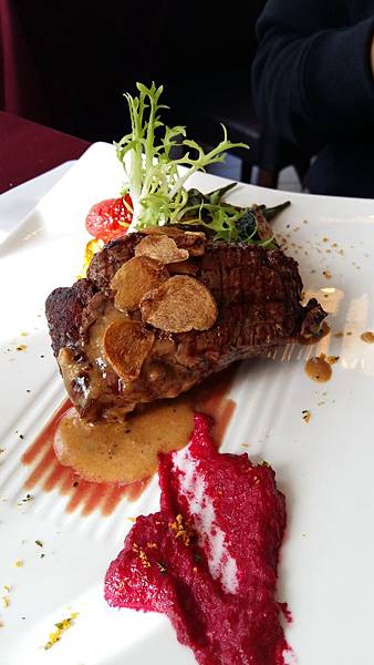奧文尼烤菲力牛排佐蒜香奶油(8oz)~兩根指節以上厚度的菲力牛排鮮嫩多汁,刀鋒落下很輕鬆的劃開,吃進嘴裡肉汁奔放,配上酥香蒜片是一種口感,配上紅色的甜菜跟醬料又是另一種味蕾的挑戰.盤邊的配菜有烤過的山葵和節瓜,非常有趣但很好吃的搭配.