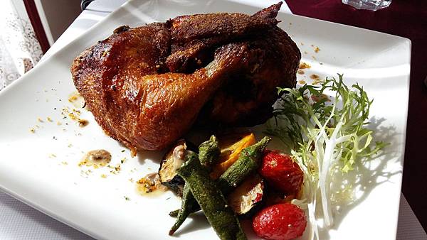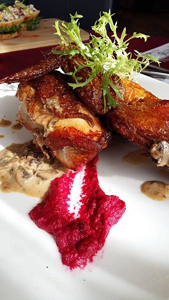 爐烤普羅旺斯烤雞佐牛肝菌醬~烤雞配牛肝菌降簡直就已經是國色天香的等級了,酥香脆的烤雞,外皮有爐烤的香氣,肉質飽滿充滿水分,吃進嘴裡頂在上顎的是疑問,這是雞肉嗎?
