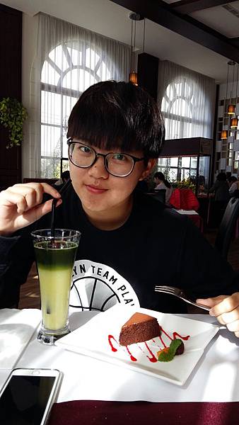 餐後甜點送上的是美研蔬果汁和巧克力舒芙蕾,不得不提的蔬果汁是現在流行的雙層,利用不同食材的比重和顏色來製作出誘人的口味,台灣芭樂配上水耕蔬菜,有芭樂的獨有清香,水耕蔬菜的營養,最重要的是沒有生菜的澀味和苦味,攪拌均勻之後入口非常好喝.