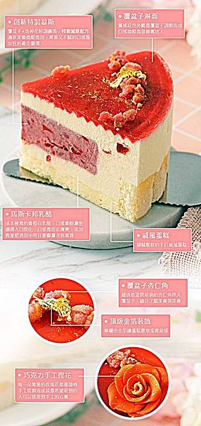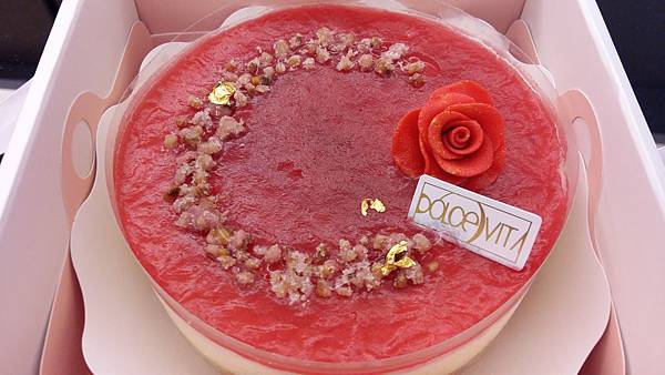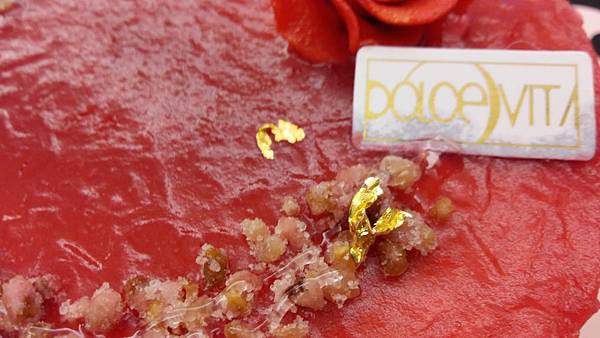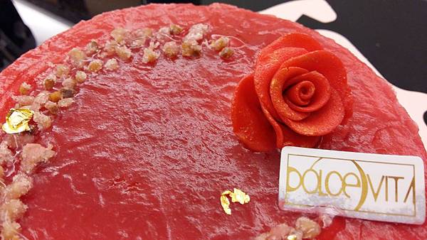 秀色可餐當然也是月之女神精采的部分之一~蛋糕表面灑上幾筆寫意的金箔,手工捏角的巧克力口味的紅色玫瑰花裝飾,那紅地毯般的覆盆子淋面挑逗般的氣息,瞬間這款月之女神就完全佔據了每一雙盯著蛋糕瞧的眼神.驚呼連連也不足以形容,大家想快點一親芳澤這慕斯蛋糕會帶來甚麼樣的味蕾驚艷?