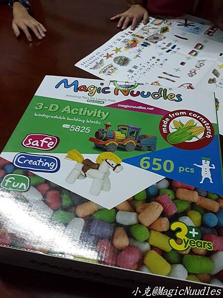 小克這組是650PCS裝,外盒開口有美國標原廠封,裡面有中文簡單使用說明,繪圖本,說明書,海綿和大海報.孩子們幾乎不用看說明書,就能馬上入手玩了起來.不論是跟著造型說明書或是繪圖卡的指示,也都能玩出自己的風格,真的是MAGIC NUUDLES無毒積木黏土在手,小朋友就自動安靜卻很開心自在地玩著.