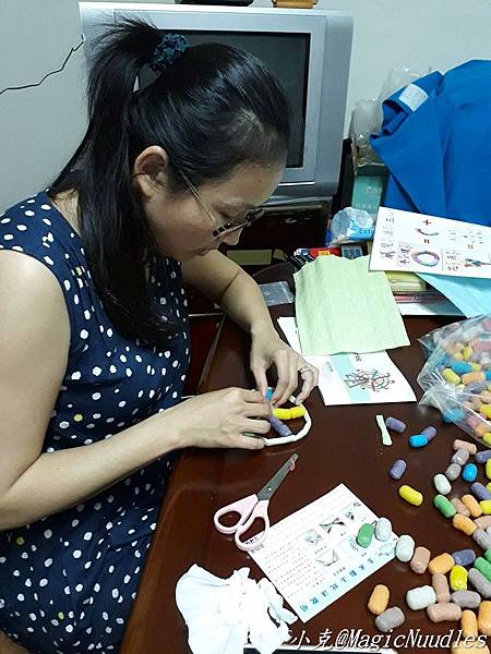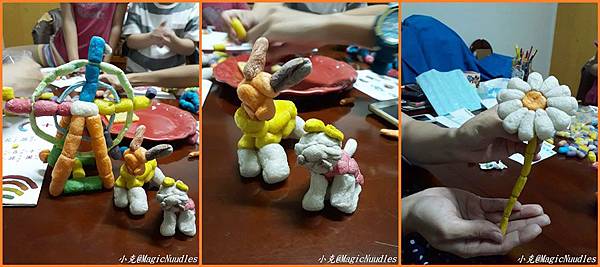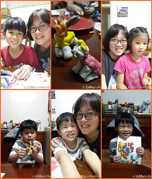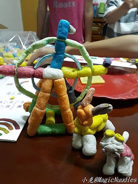 孩子們開開心心又乖乖地玩著無毒積木黏土,不論是自己的發想,或是照著教本上的圖樣,或是根據畫本黏貼塗色,大家很快地找到自己想樣做的東西.然後只要沾濕黏接塑形就完成了.創意不只是紙上談兵,很快就能變成實體,還能和其他人分享自己是怎麼做出來的樣子.當然我這新手長輩貢獻的這個MAGIC NUUDLES無毒積木黏土,又讓我贏得小朋友的心囉!不過我突然發現媽媽怎麼也變得那麼安靜?原來她也忍不住玩了起來,說要做個摩天輪送給小克啦!