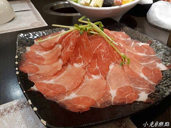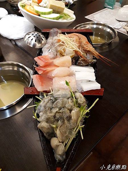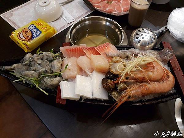 梅花豬的肉片厚度剛好,太薄沒有口感,太厚吃不出質感,當然新鮮是完整呈現,從油花分布和端上桌以後的解凍速度就知道了.上來的食材都是讓人感到多而滿足,物超所值得很,尤其看到海鮮總匯的那艘龍舟就能明顯感受到了.
