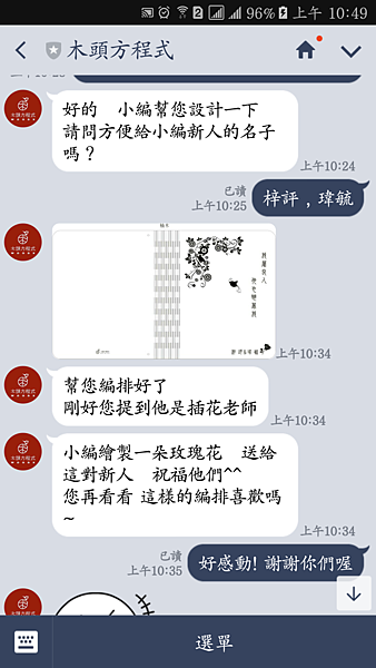圖案我選了木頭方程式圖庫裡面的花鳥,因為好朋友喜歡花草又是插花老師,加上婚姻是兩人結為比翼鳥,一隻鳥停在枝頭上,另外一隻飛來相遇,這個圖案真的寓意深刻囉!當然要加上小克的祝福字句在上面~我屬良人,他也戀慕我~這是改寫自聖經裡面的句子,我相信也是幸福的兩人一輩子竭力追求的愛情.字體我選的是新篆體,設計師幫我做了排版建議給我看,真的是非常漂亮喔!而且還貼心的提醒我要加上新人的名字,並且把裡面的絨布換成紅色的,太棒了!