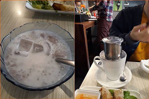 我們的飯後甜點是越式咖啡和芋頭西米露,咖啡沒有甚麼特別之處,冠以越式之名就喝看看囉!倒是芋頭西米露很不錯,芋頭香西米露滑順,整晚甜度夠,每湯匙舀下去都有芋頭,真的是cp值很高的甜點.這裡的每道餐點都是現點現做,但出餐的速度還是很快,雖然只有兩位服務人員,但面對一屋子的客人,還是很有活力而且行動迅速;不管點餐出餐或是整理,都有禮貌的應對進退,讓我們真是賓至如歸.