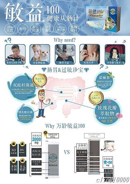 家中的老人或小孩腸道機能尤其要注意,敏益100益生菌可以直接加在果汁裡面,方便他們飲用.只要腸道裡面的益生菌增加,提高身體機能;只要他們健康,我們作父母或是子女就沒有後顧之憂囉!敏益100益生菌是經過設計具有黃金比例複方的益生菌,非常特別的使用了玫瑰花瓣萃取物加上諾麗果,再加上嗜乳酸桿菌和兩岐雙崎桿菌;其中有效成分達2000mg.建議你像小克親自體驗,就能感受到幾天後的自己有甚麼不一樣了!