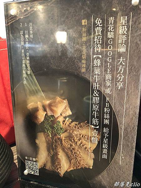[青花驕]的座位非常寬敞舒適,拍照也很方便,彼此交談可以很輕鬆,不用擔心影響鄰座,旁邊還有小桌可以擺放上來的新鮮食材,不會整個桌面擁擠.醬料區還有切肉區,都很乾淨,也讓人看得很清楚.