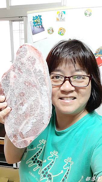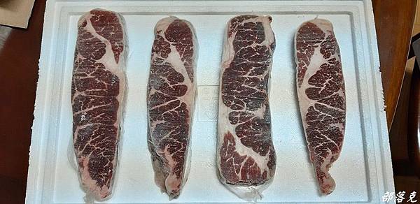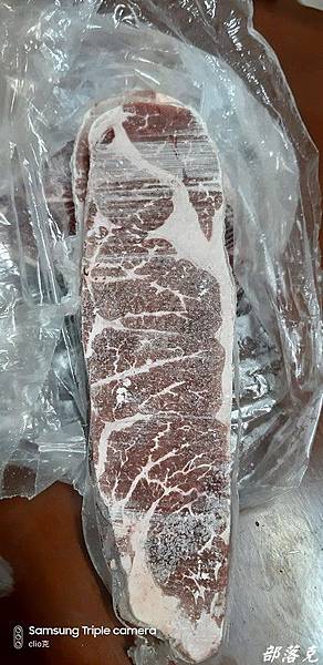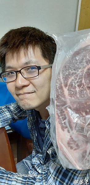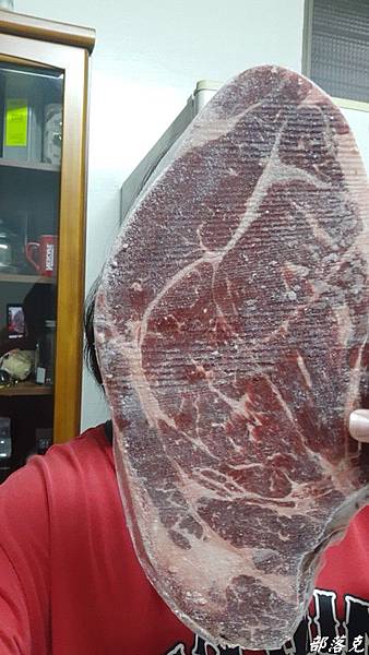 有機會可以邊看直播邊下訂單,除了可以聽到師傅專業的介紹,你也可以清楚看到你買到的是甚麼樣的肉品.(這次是朋友訂了直接寄送給小克,所以沒看到精采的直播).此品是濕式熟成原肉塊,講究品質保持現切原塊,所以不做加工真空處理,還可以外面(肉邊處)有一層薄膜喔.看看照片裡面的翼板牛排(上)和比臉大的沙朗嫩肩牛排(下),肉質紮實油花分布均勻;整塊顏色統一,而且肉邊還有薄膜,原肉現切才作得到.真的比臉還大,小克的臉都看不到了.