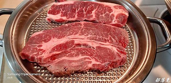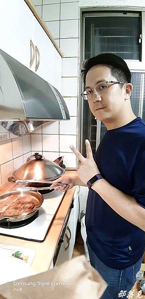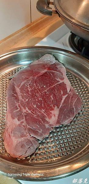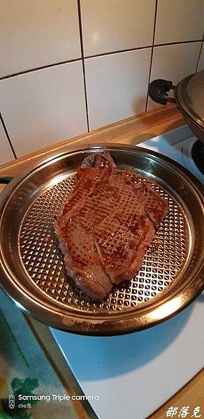 小克用的是油脂分離鍋,等整個鍋溫達到50度之後,把牛排放下後蓋上鍋蓋,關火改用高溫悶煎,計時一分鐘後準備翻面.開火開鍋蓋翻面,計時一分鐘,蓋上鍋蓋讓溫度達到50度後關火繼續一分鐘的時間.呼呼~這香味更是在屋內四處流竄.