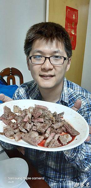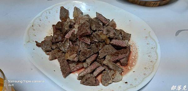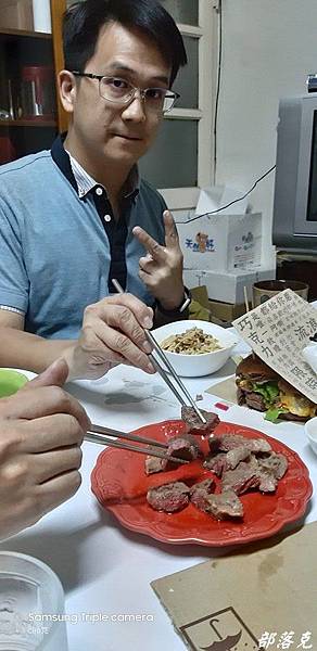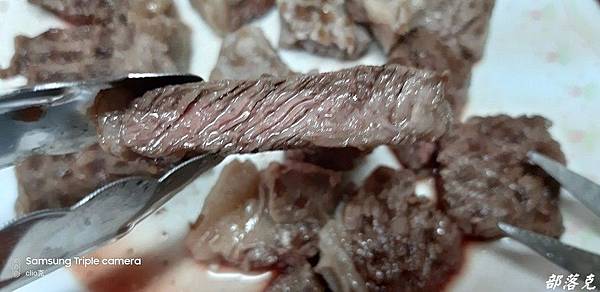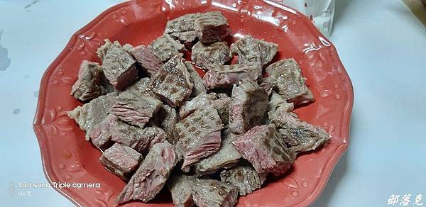 尤其是聚餐,牛排是最簡單卻又最突出的料理,咱們的黃董同時煎翼板和沙朗,要來餵飽我們這些嗷嗷待哺,整間廚房的牛肉香氣四溢,連剛開門上樓的其他朋友都忍不ˊ住大呼~~煎牛排了嗎??瞧瞧解凍之後的肉色一樣艷麗動人,完全生鮮的模樣,是不是原肉現切的原牛塊馬上一目了然.不過黃董把兩種牛排煎好之後剪切混在一起了,要來考考大家分辨得出來嗎?不過誰管你啊~先大快朵頤了再說吧!