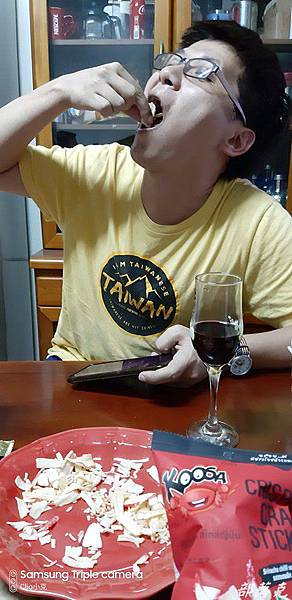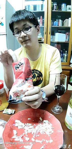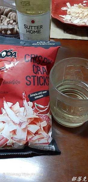 辣醬風味Sriracha~由Sriracha辣椒醬製成,甜中帶辣連小克不能吃辣的人也都愛上這個滋味.而且意外地和白酒或紅酒都能巧妙的搭配,瞧~朋友只顧著品嚐都不看我的鏡頭正在拍他了.