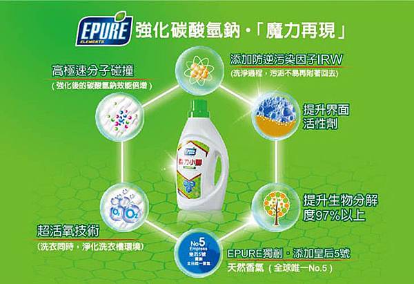 人要衣裝,不僅僅是穿得體面好看,也要符合場合.但重要的是能穿乾淨的衣服,還有讓衣服變得更乾淨.EPURE恩普樂魔力小蘇淨化濃縮洗衣精,它具有長達48小時的99%抑菌效果,還可淨化空氣汙染當中可惡的PM2.5,有效抑制四大細菌和去除99種污漬。.添加了防逆污染因子IRW,讓髒污不附著回去。獨創NO.5 Empress(皇后5號)香氣,讓衣服散發出淡淡的清香.通過SGS認證99%生物可分解,對環境友善.洗衣同時做環保,何樂而不為呢?