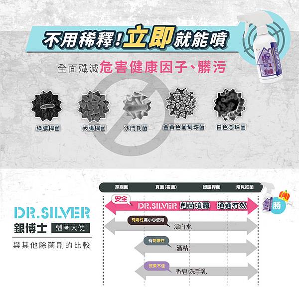 DR.SILVER銀博士剋菌大使,有99.9%超強除菌力,而且溫和不刺激.不論是誰都能輕鬆使用他,也不用稀釋或調配非常方便.能用在任何角落或是個人的隨身用品,一瓶搞定除菌抗菌除臭,24小時長時間有效的最佳工具.