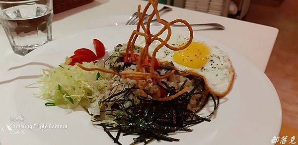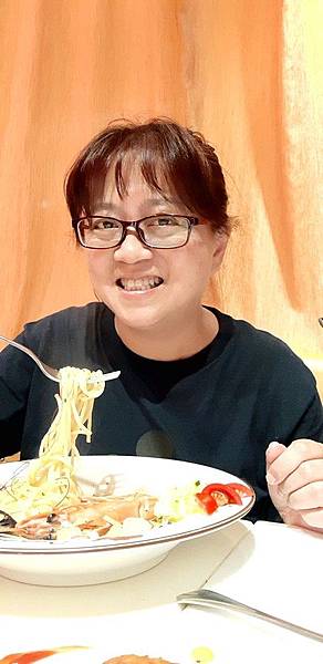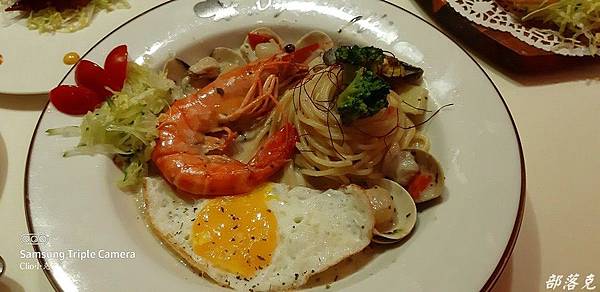 小克點的是海大蝦佐松露義大利麵,朋友點的是焗烤總匯海鮮燉飯,海鮮在這裡發揮了強大的新鮮又真材實料的作用,讓我們的主餐不論是海鮮總匯或松露明蝦猶如徜徉在大海一般,配上紅袍辣椒絲的耀眼和驚艷著實讓我們血脈噴張了.