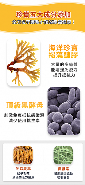 寵樂芙~褐藻酵母王 2.0膠囊版除了褐藻醣膠之外,還加了黑酵母和纖維素,漢方藥材中非常重要的冬蟲夏草也添加在裡面;真的是全方位的營養補充.改善寵物的敏弱體質,或是因為老化而造成免疫系統下降。毛孩的飲食狀況’良好,自然就能補充正確和需要的營養素,有了營養才能抵抗來自外面的病菌侵襲,也才能從身體內部來解決許多莫名的虛弱狀況.