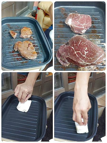 每換一樣食材,每煎烤完一樣盤面當然會有油汙,直接放下一樣食材真的比較不好.不沾鍋設計只要用餐巾紙稍加擦拭,就乾乾淨淨了,衛生也兼具真的很好用.