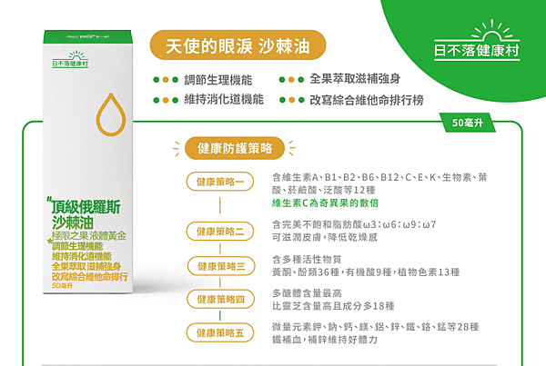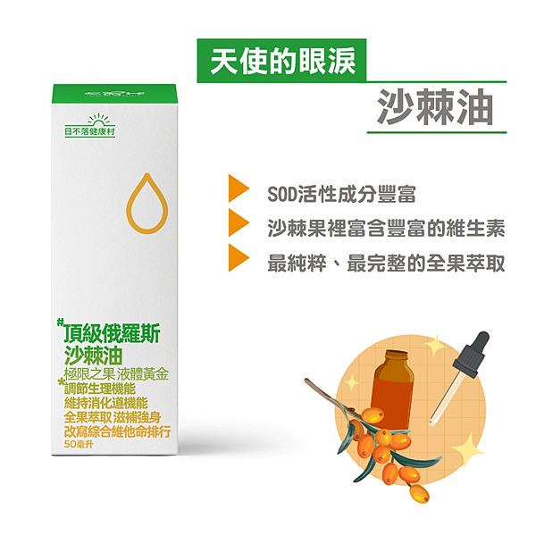 一個成功的男人背後是誰?當然是健康的身體做後盾啊!日不落健康村出品~天使的眼淚頂級俄羅斯沙棘油.有著極限之果之稱的沙棘,採用全果低溫冷壓離心萃取成沙棘油,更有液體黃金之美譽.他的Omega3、6、9 完美比例,並同時擁有Omega7.含多種活性物質SOD,包含維生素A、B1、B2、B6、B12、C、E、K.我們的身體需要各式各樣的營養素來協調,有了天使的眼淚頂級俄羅斯沙棘油更簡單又方便.