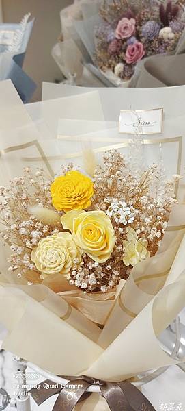 這樣的小花束可愛又討喜,永生花搭配木雕花的話,木雕花可以噴上香水.想送花又有預算限制,這些也能表達情意.蠻適合第一次見面,或第一次想送女朋友花的人.