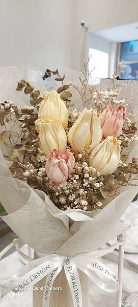 我喜歡帶點喜氣的粉嫩色系,比較高窄的花型;有框罩在外面比較好保存,不容易碰壞也不容易弄髒.朋友覺得這個蠻適合我的,於是看盡千帆最後選了這個.雖然跟我本人的個性不太像,可以增添柔美氣息.本身有搭配透明外盒,可以選顏色,店家也可以在卡片上打上名字或祝福的話.對於送禮而言,真的是方便許多.